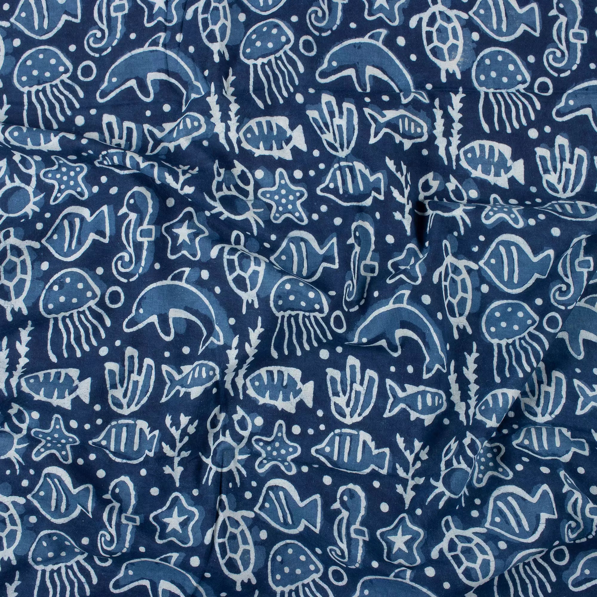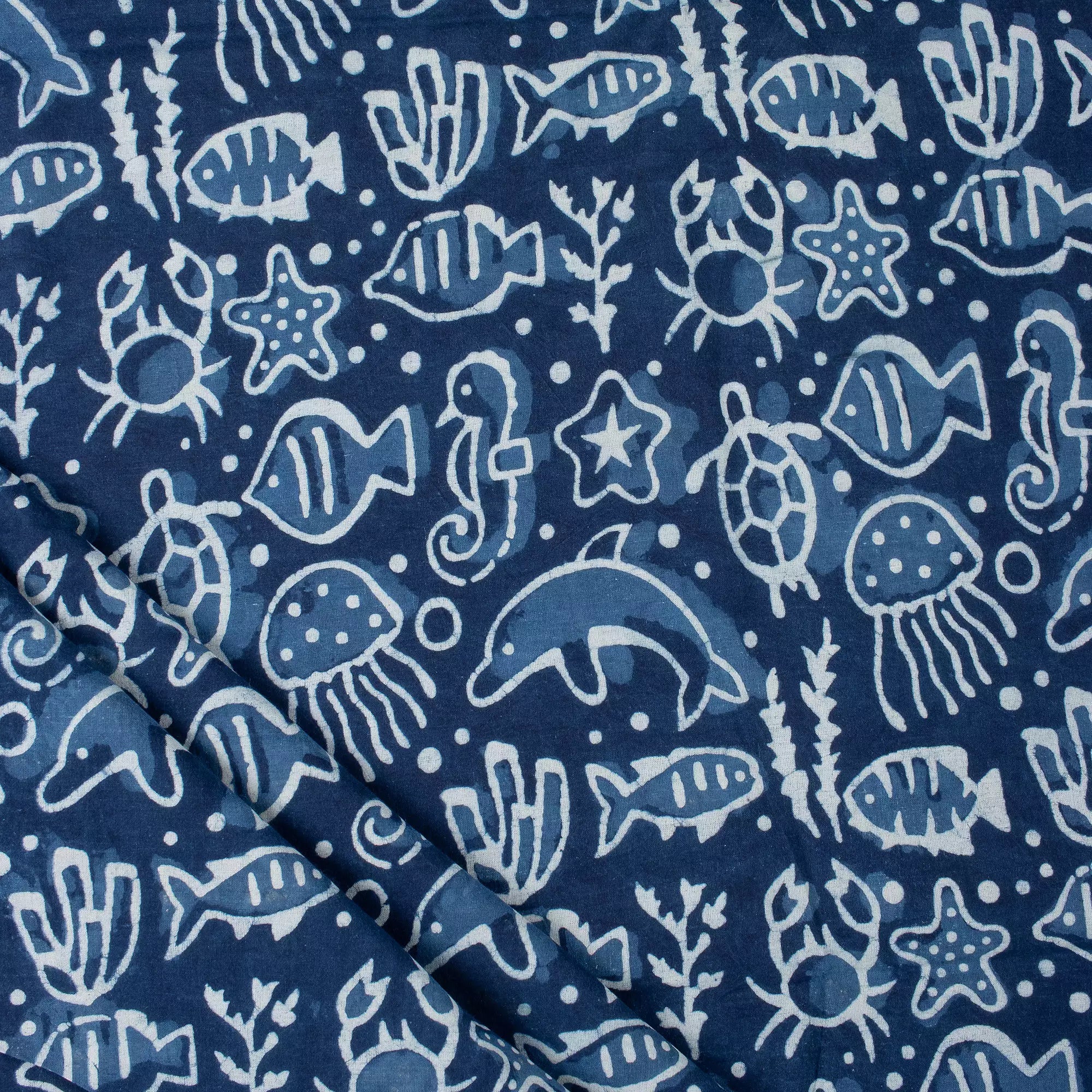 Hand Block Printed Aquatic Animals Indigo Dress Material Fabric