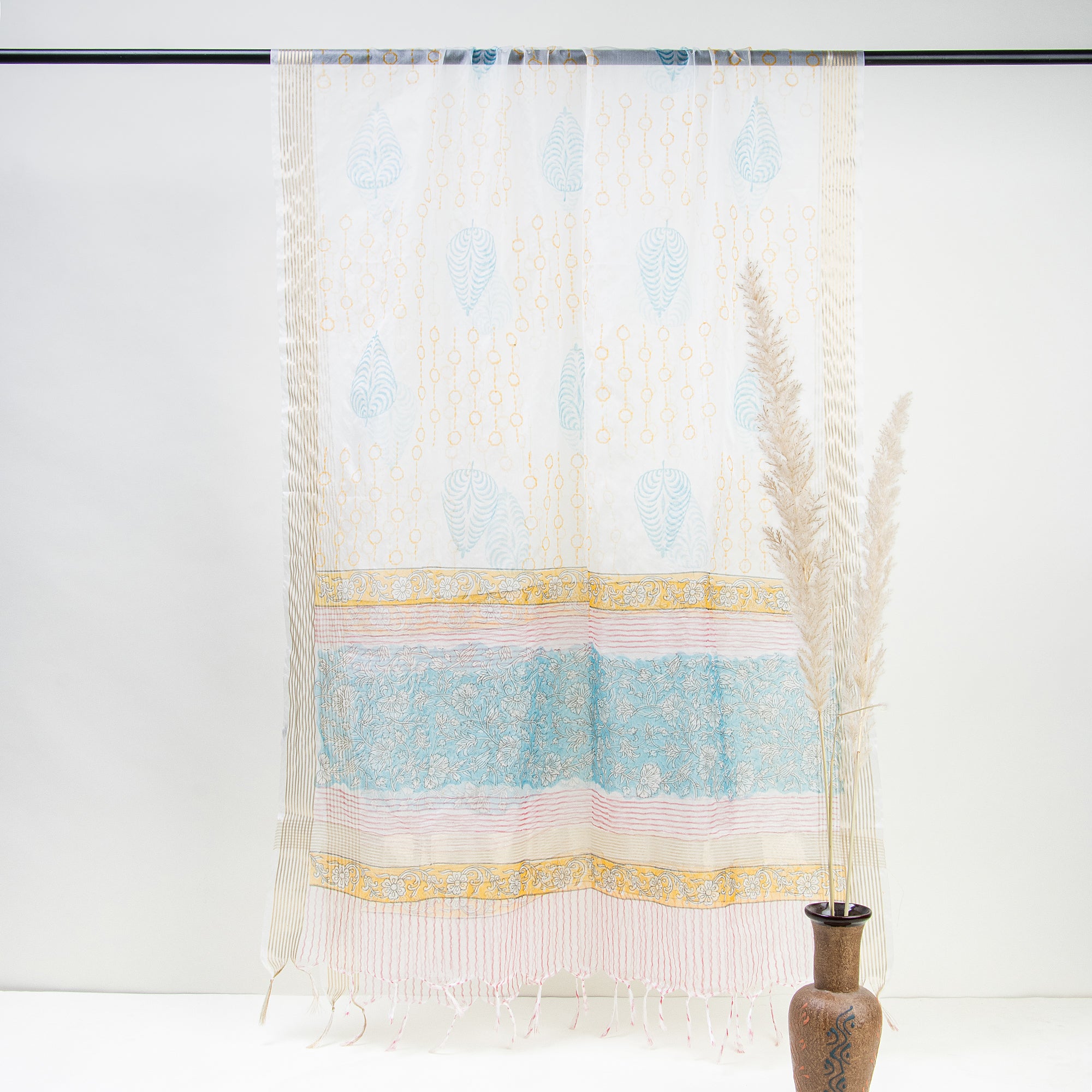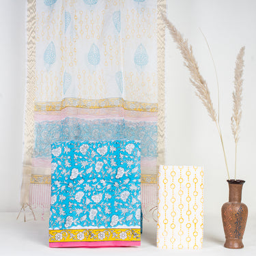 Handmade Blue Leaf Print Woman Unstitched Suits Cotton Set Organza Dupatta