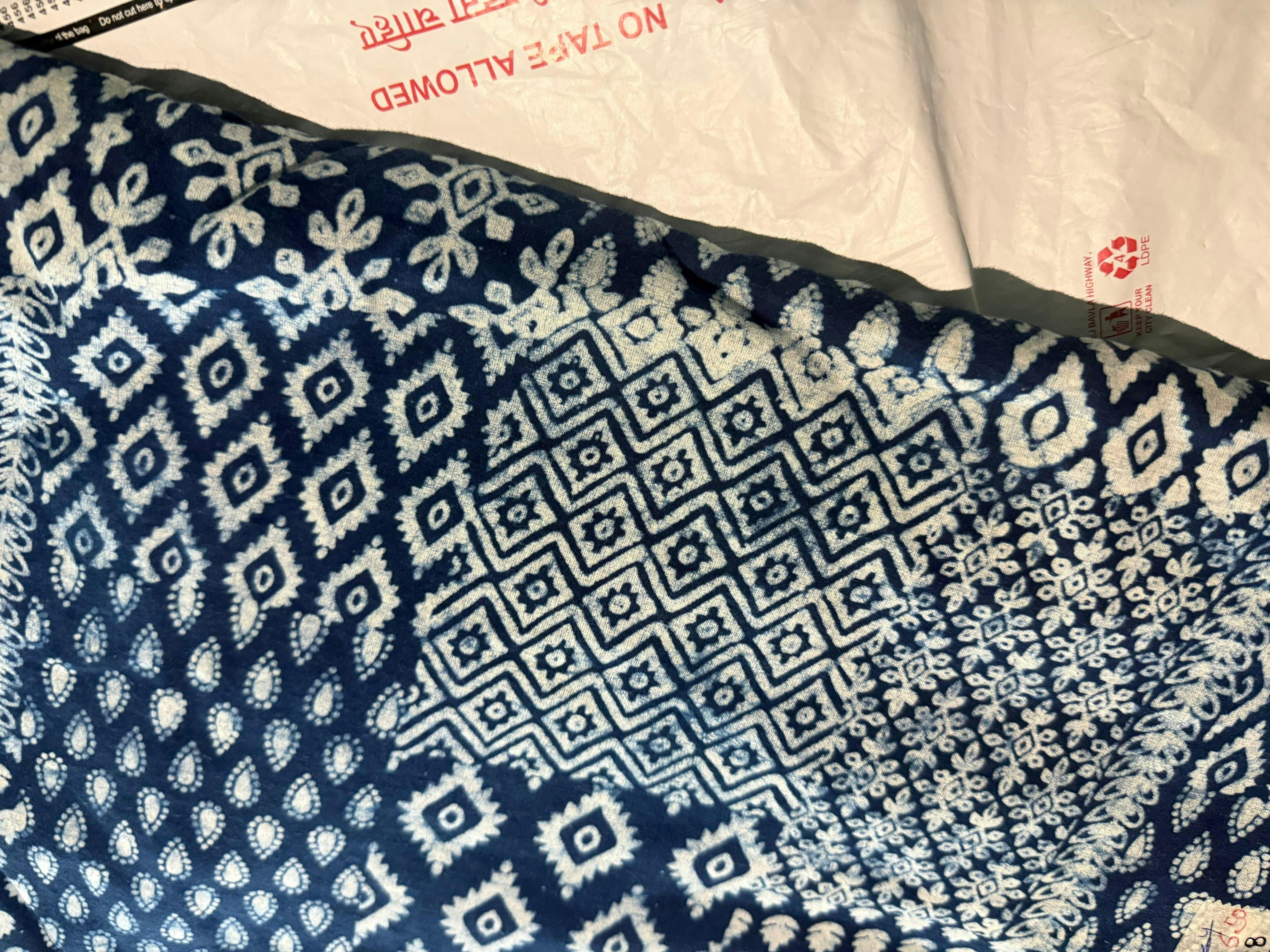 This fabric is dyed with natural indigo and may bleed in the first few washes. Hand wash separately in cold water with mild detergent. Do not machine wash. Dry in shade.