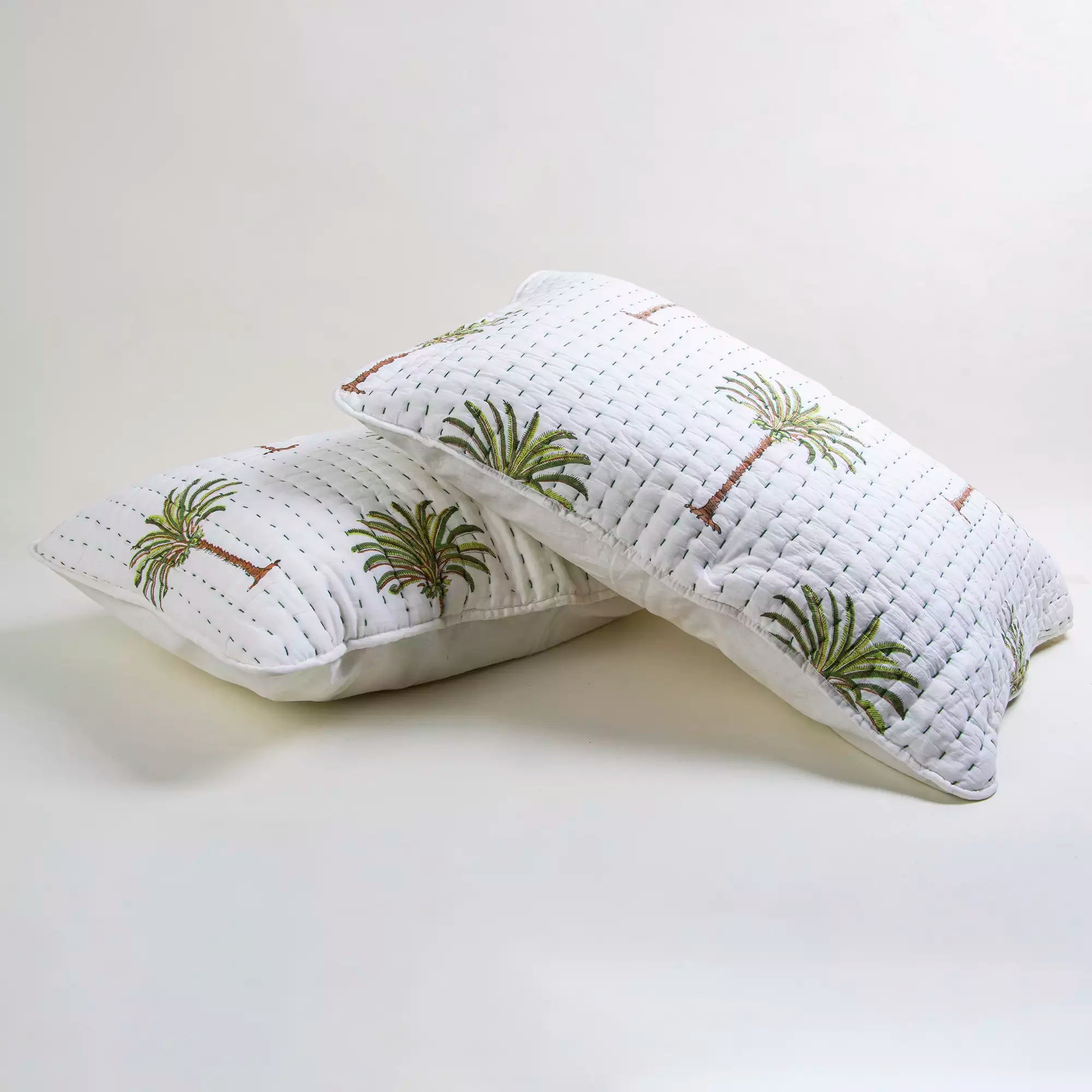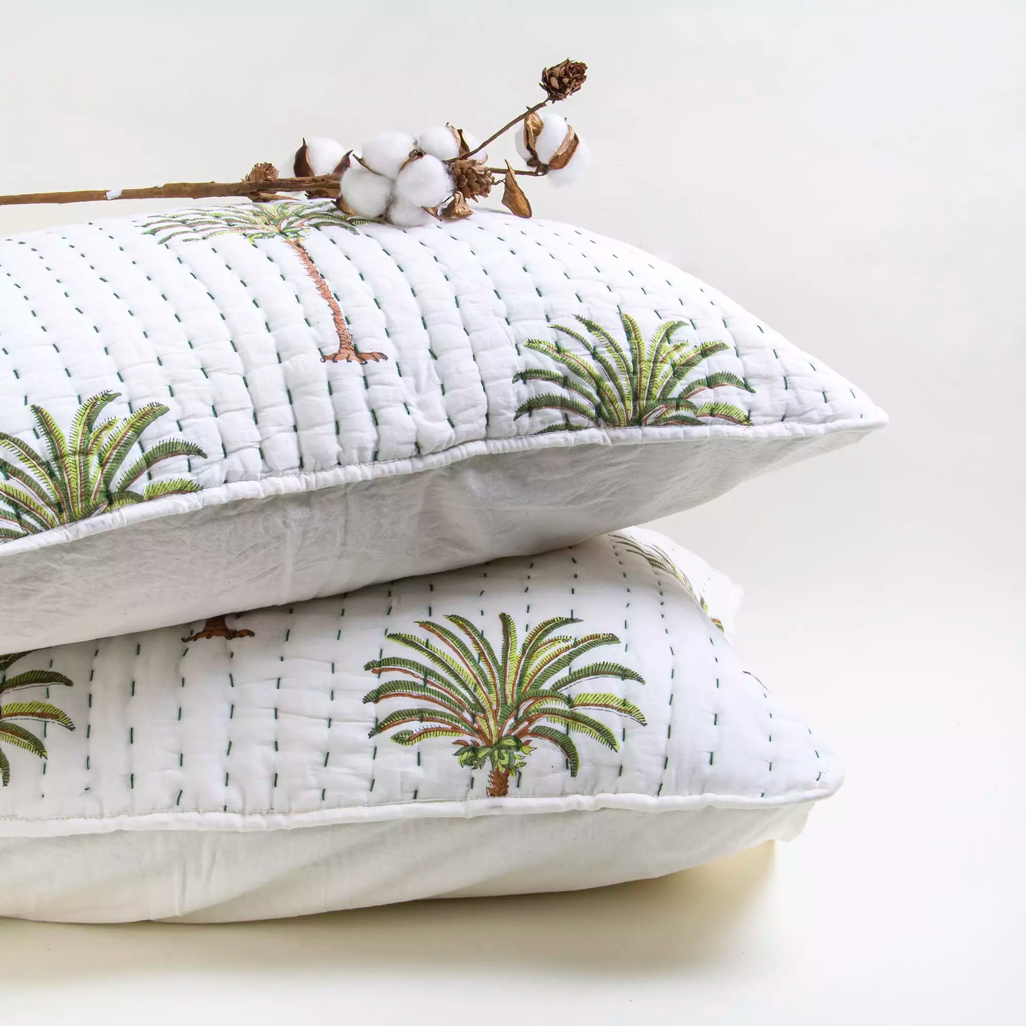 Green Block Printed Kantha Quilted Cotton Pillow Cover