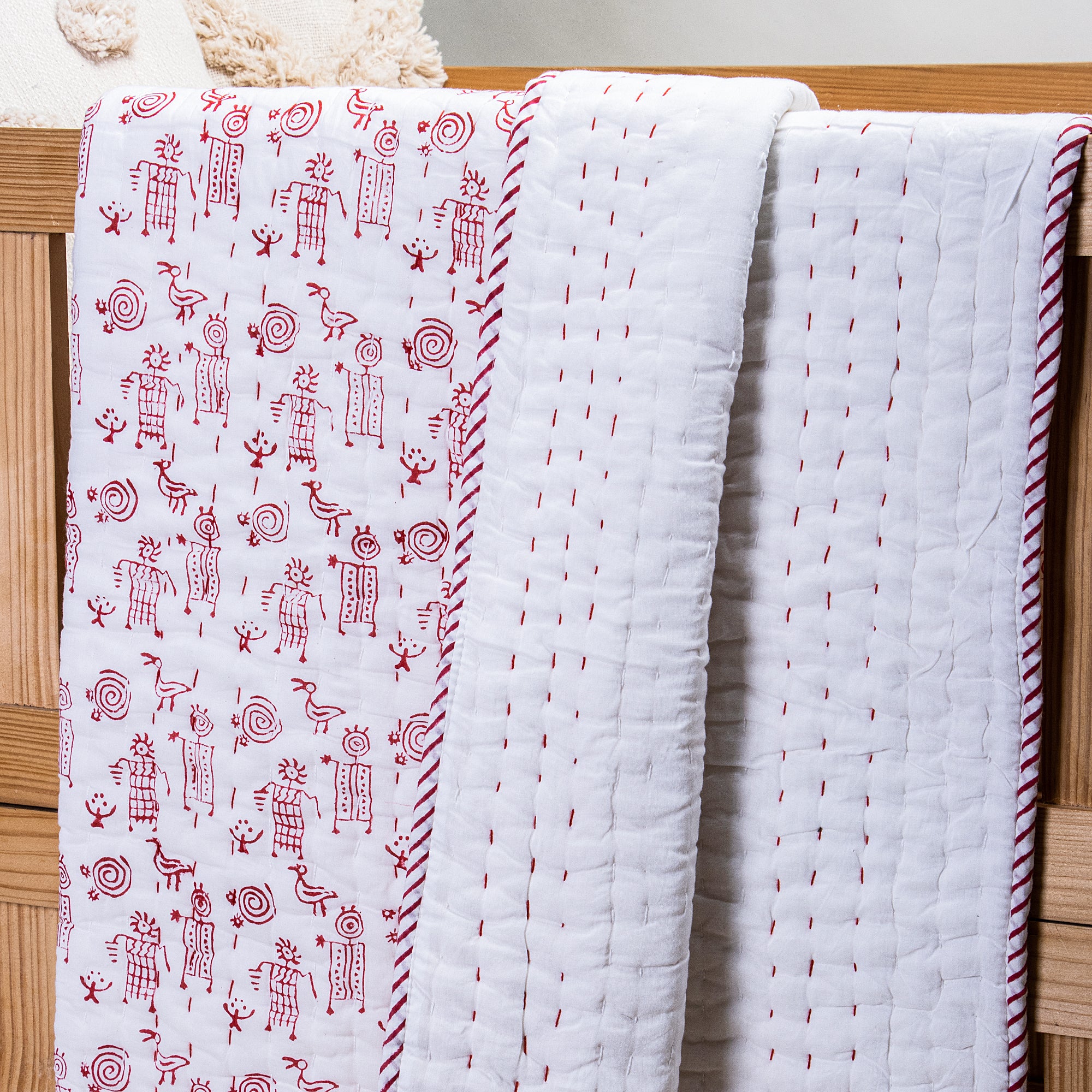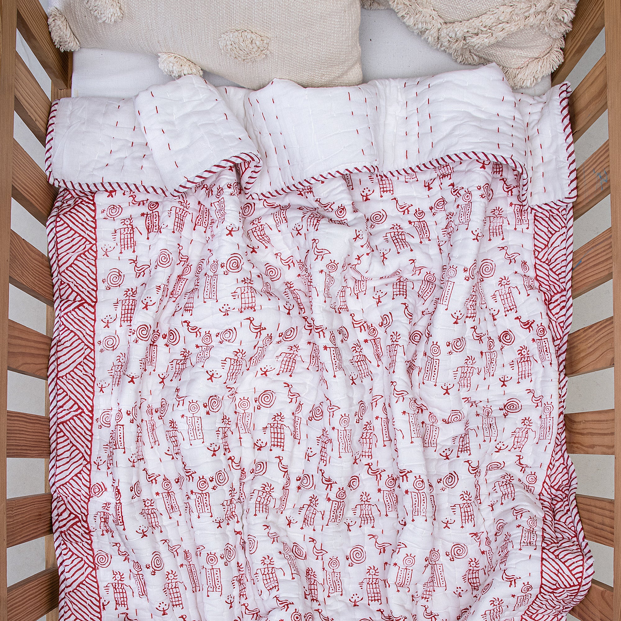 A collection of baby quilts and blankets showcasing a delightful array of designs and fabrics, each piece crafted with meticulous care and creativity. From whimsical patterns featuring playful animals to timeless geometric motifs, these baby quilt patterns are a perfect blend of charm and comfort for your little one. The diverse selection of fabrics includes muslin baby blankets and cotton baby blankets, ensuring a tactile and visually engaging experience. Whether adorned with cheerful polka dots or soothing floral arrangements, each baby blanket set is a unique and cosy masterpiece, adding a touch of warmth and style to any nursery.