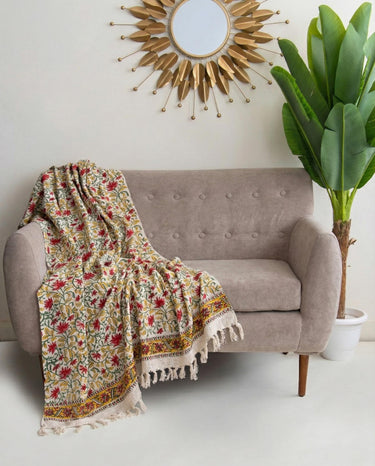 Hand Block Floral Printed Pure Cotton Sofa Throw Blanket
